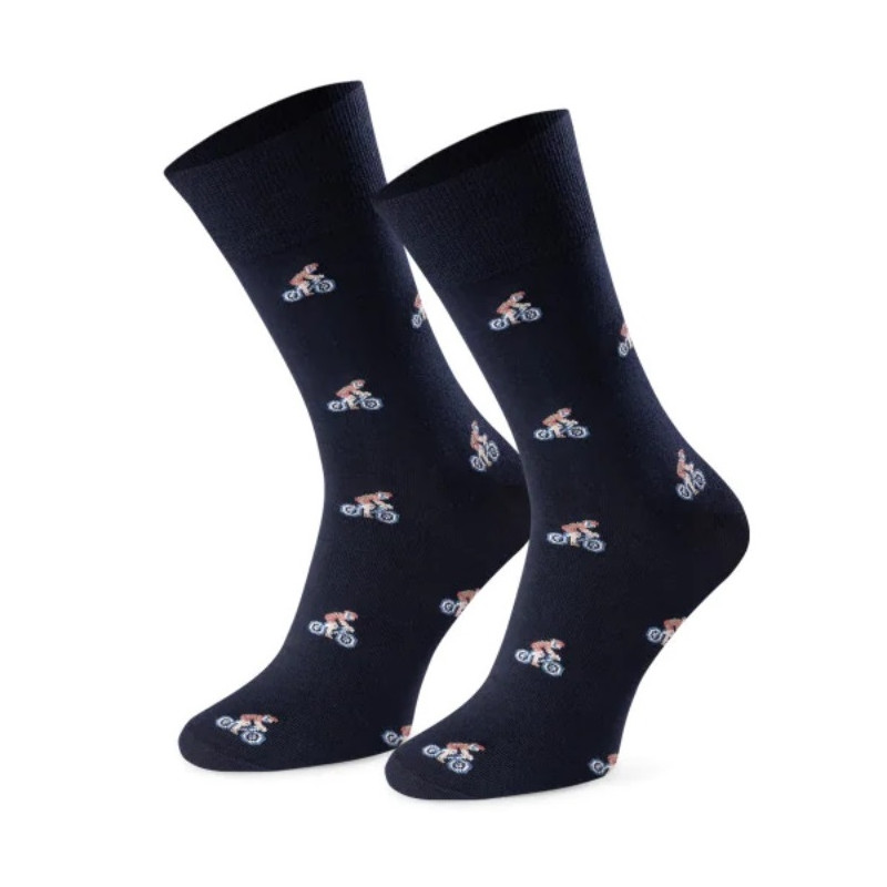 Ponožky klasického vysokého strihu určené pre pánov a veľkých chlapcov (ale pokojne aj pre dámy), nielen pre milovníkov cyklistiky. Vzor - cyklista - je vkusný a vhodný k džínsom, športovému outfitu, ale aj k obleku. Sú príjemné na dotyk, z priadze s vysokým podielom bavlny a majú retiazkovú špicu, ktorá netlačí v topánke a príjemný roztiažny lem.