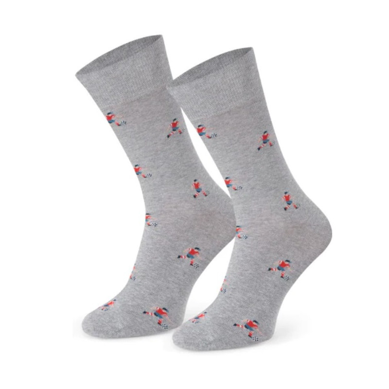 Ponožky klasického vysokého strihu určené pre pánov a veľkých chlapcov (ale pokojne aj pre dámy), nielen pre milovníkov behu. Vzor - futbalista - je nenáročný, vhodný k džínsom, športovému outfitu, ale aj k obleku. Sú príjemné na dotyk, z priadze s vysokým podielom bavlny a majú retiazkovú špicu, ktorá netlačí v topánke a príjemný roztiažny lem.