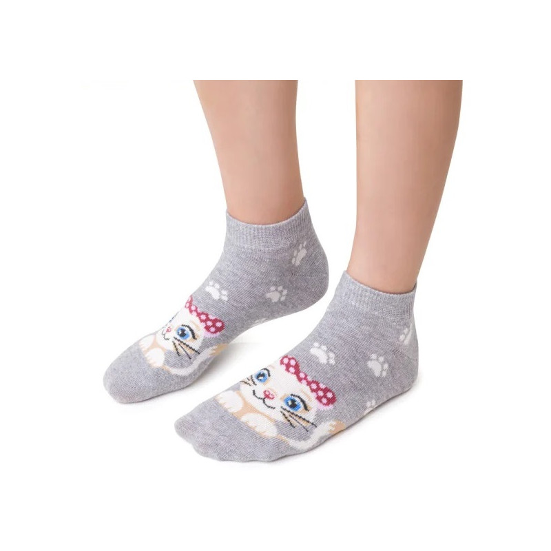Veselé vzorované obrázkové bavlnené ponožky pre menšie dievčatká, vzor tvoria otlačky labiek a na špici je obrázok mačičky s mašľou. Sú vyššie, ako je na fotke = klasického strihu. Majú retiazkovú špicu.