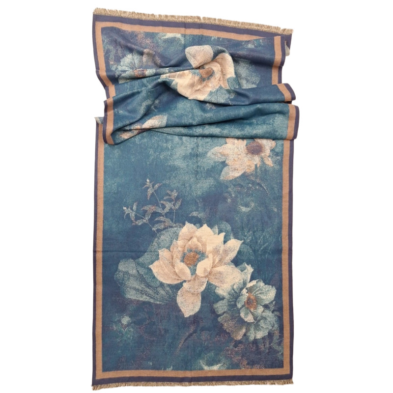 Extra mäkký, hladký a hrejivý šál pre dámy, ktorý skvelo doplní váš vzhľad na kabát, bundu, alebo na pulóver. Vzor tvoria kvety ako sú lekná, maky, margaréty, ruže a kapucínky. Ukončený je jemnými strapčekmi.